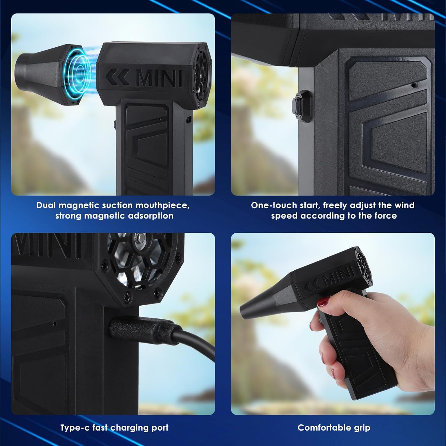 - 【Dual Magnetic Suction Mouthpiece】:Two powerful magnetic suction mouthpieces, strong magnetic adsorption, solid adsorption does not fall off. One key to start, stepless variable speed, multiple modes of free switching. Compared with compressed air canisters, the cordless blower can be recharged and used repeatedly, you provide a long-lasting and efficient cleaning experience.