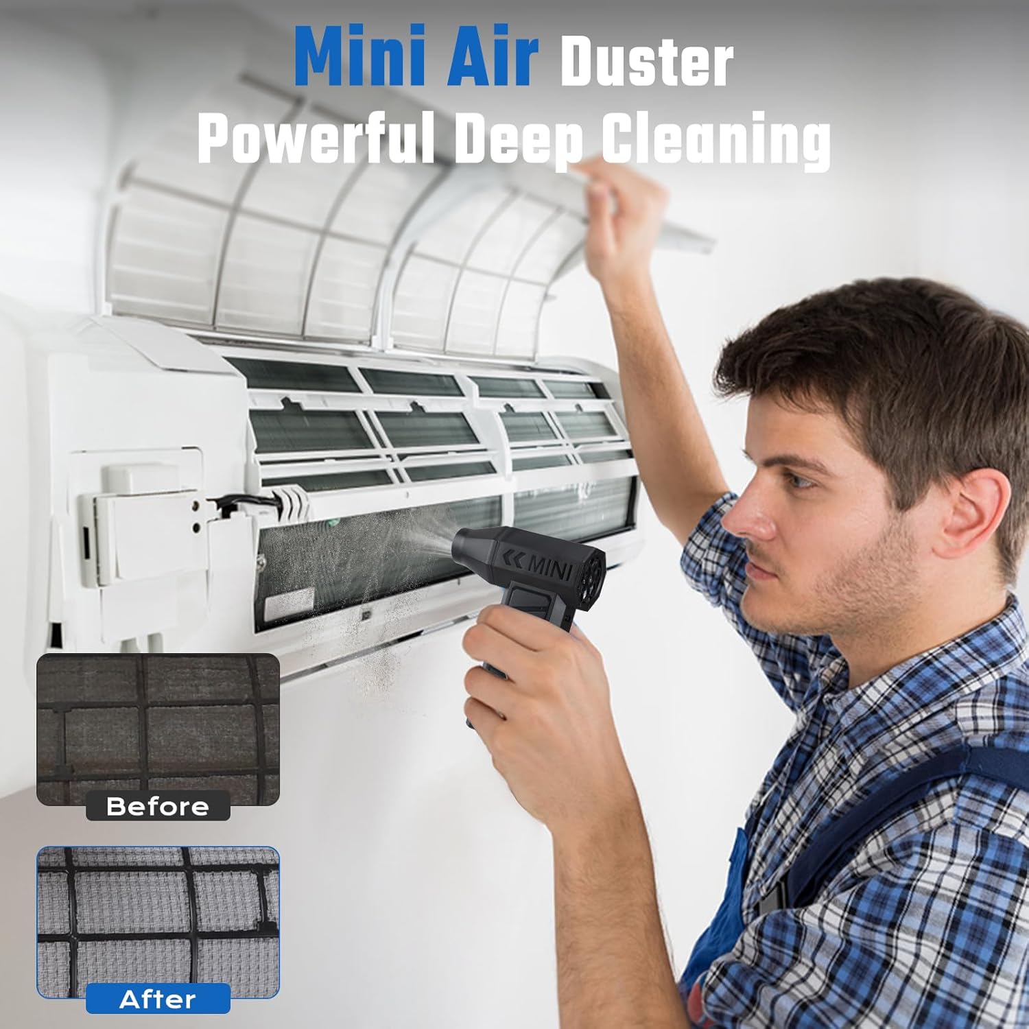 - 【Stable & Powerful Cleaning】This hair dryer is powered by a powerful brushless motor with a speed of 100,000 RPM, delivering peak air speeds of 41 m/s or more. Our mini air duster has a quick and powerful cleaning ability with 3 adjustable speeds and super strong wind power at the touch of a button, perfect for home, office, car and outdoor use.