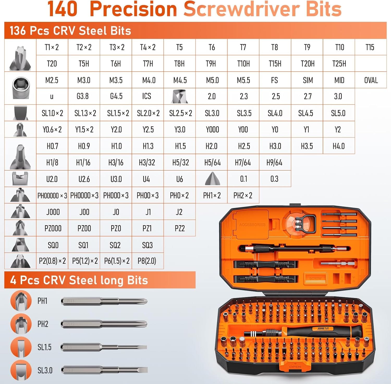 - 【Precision Screwdriver Set】 This set has 140 bits in multiple models, including Torx , Phillips, Pentalobe, Star, Triwing, Triangle Etc, covering most screwdriver models on the market. the 4 long bits can help you remove deeper screws. Some commonly used screwdriver bits are also equipped with 2-3 bits of the same model as backup.
