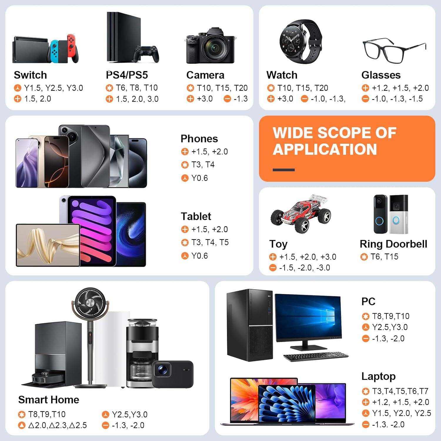 - 【Wide Range of Application】applicable to iPhone/Samsung/Huawei and other cell phones; Mini/Air/Pro and Huawei/Honor and other tablet PCs; Macbook/Air/Pro; Kindle/Kindle Fire; Ring Visual Doorbell/Visual Doorbell 2/Pro/Elite; PS4/PS5/XOBX game consoles, as well as PC laptop computers, jewelry, toys, aeromodels, drones, remote-control cars, and some small household appliances such as coffee machines.