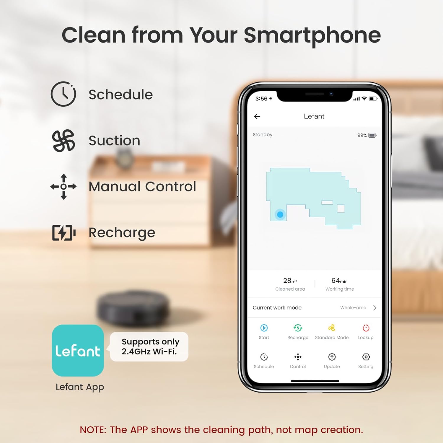 - Lefant robot vacuums only support 2.4GHz WiFi. It is recommended to switch to a 2.4GHz network when using the robot by following your router’s setup instructions. NOTE: Before first use, please open the cover, switch the little button to ‘I,’ and ensure the robot is turned on and fully charged.