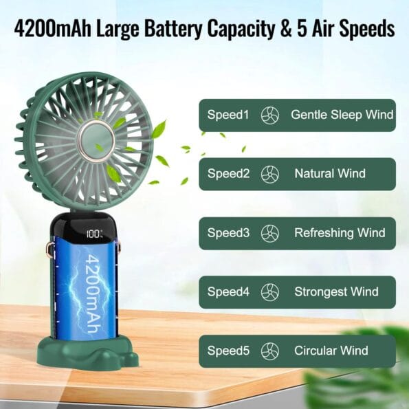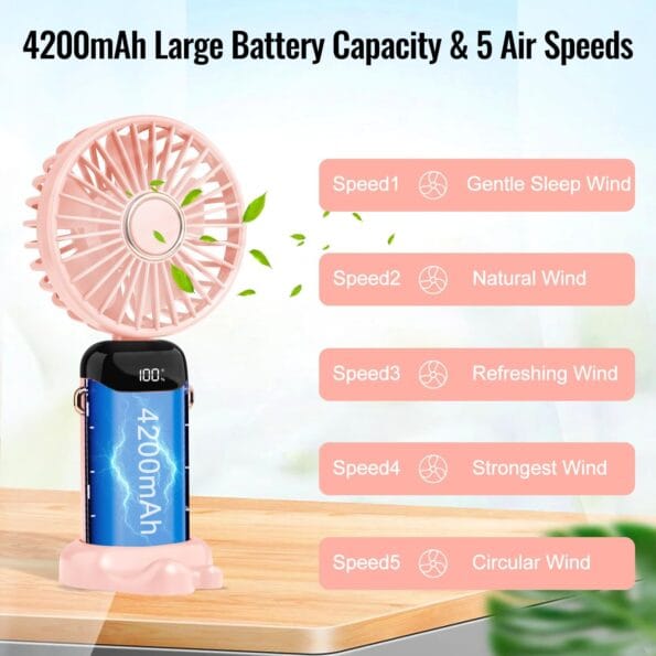 - 【FIVE ADJUSTABLE WIND SPEEDS】The hand held mini fan has five adjustable speed levels that you can switch by pressing a button. It helps cool you down in hot weather and lets you stay refreshed and comfortable.